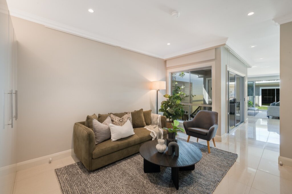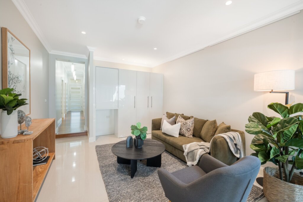 - Lounge area with integrated cabinetry, study nook, and bar fridge space