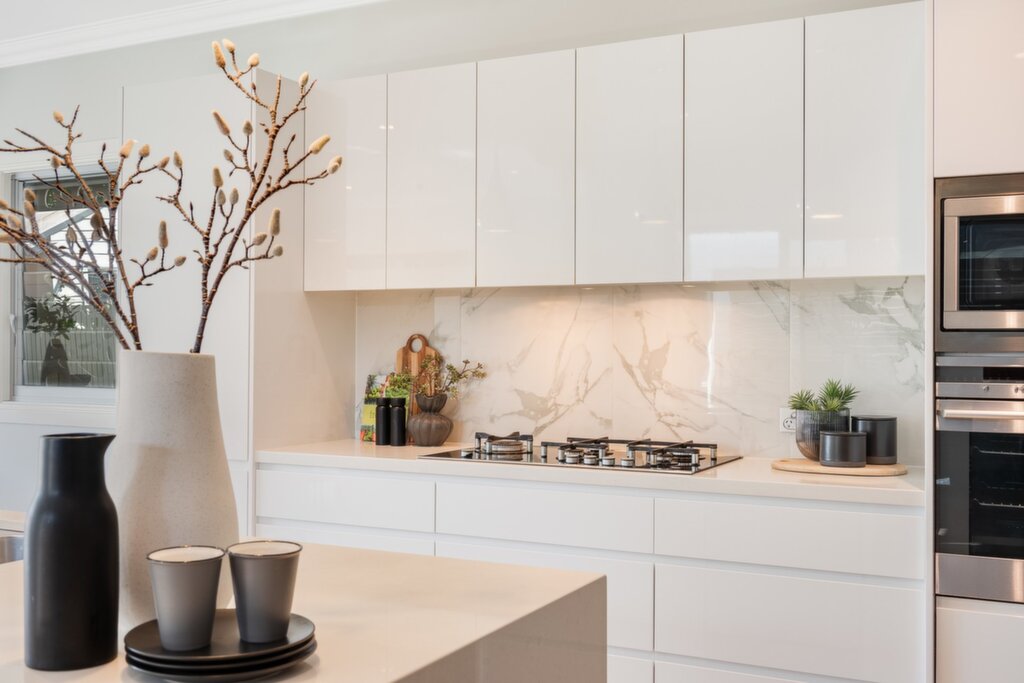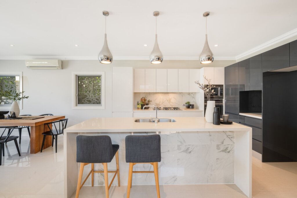 - Island kitchen, Caesarstone benches, 900mm gas cooktop, wall oven, microwave, plumbing for fridge