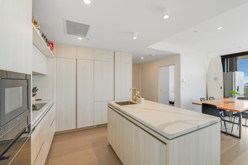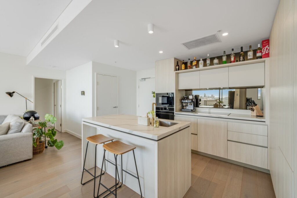 Inside this fully air-conditioned apartment, the living space unfolds seamlessly to a generous balcony designed for entertaining or quiet moments with a glass of wine as the harbour thrums during the day and the city lights glow at night. Both bedrooms share the same stunning outlook, paired with a master ensuite and second shower bathroom. The island kitchen blends luxury and function with Smeg appliances, stone surfaces, and plenty of integrated storage. Practicality hasn't been forgotten either, with a storage cage and two side-by-side parking spaces so you don't have to bother your partner when it's time to head out.