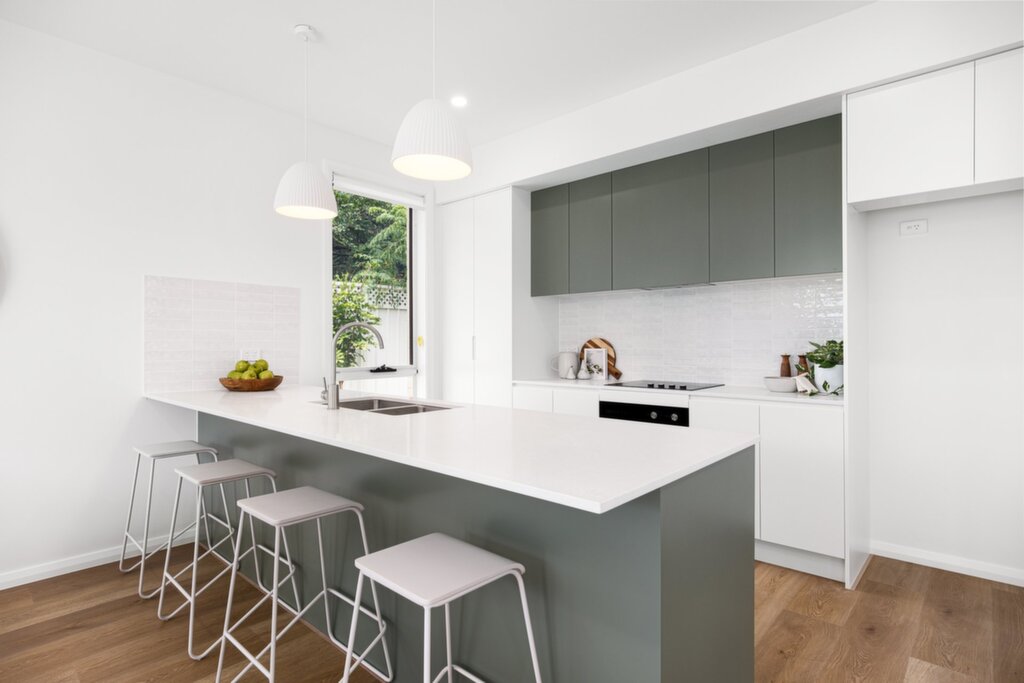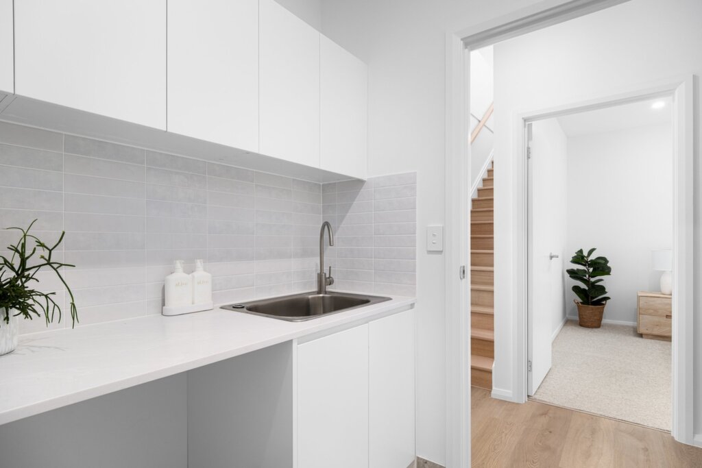 - Kitchen with stone benchtops, Fisher & Paykel appliances, fridge plumbing, and sleek finishes throughout