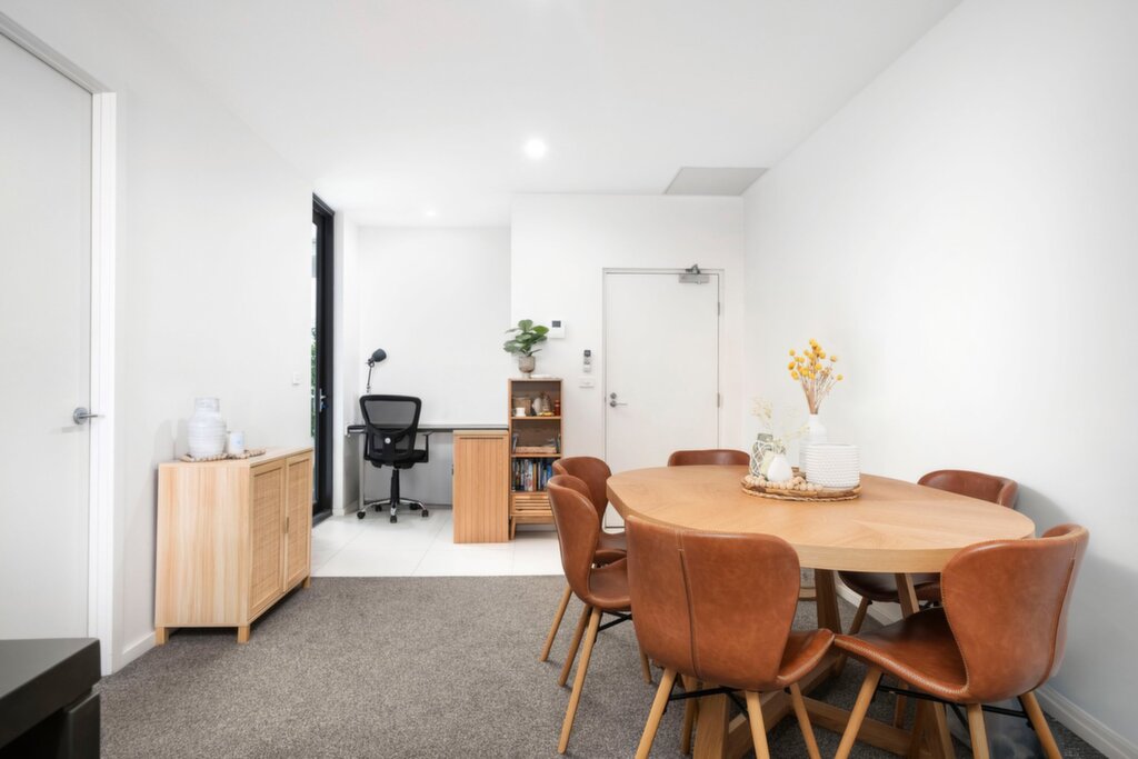 Inside, the open plan layout feels generous and well considered, anchored by a Caesarstone island kitchen and finished with a built-in study nook that makes working from home feel genuinely workable, not like an afterthought. Living and dining flow seamlessly outdoors to a partially covered terrace offering more than 25sqm of alfresco space, making it the ideal spot for long lunches, evening drinks or simply enjoying the city skyline. At the front, a private internal courtyard adds a second outdoor zone that's perfect as a quiet retreat, a spot to keep kids' toys out of the way, or even a dedicated space for your exercise equipment. Two robed bedrooms are complemented by two sleek shower bathrooms with full-height tiling and face-level storage, while a single garage and storage cage round things out.