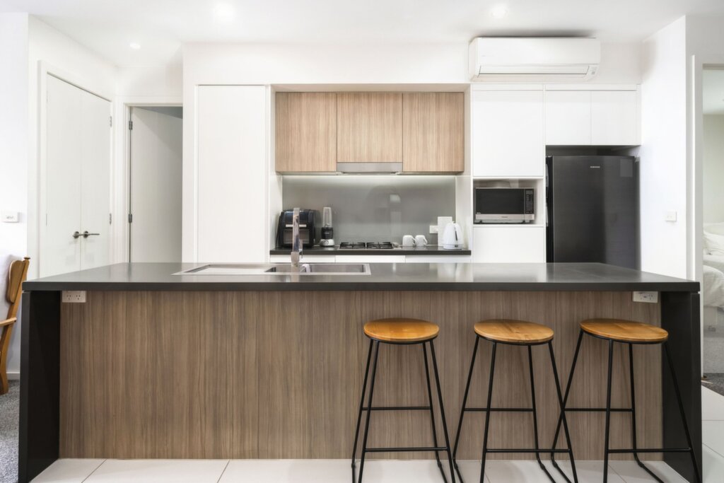 - The kitchen features stone benches, gas cooktop, under bench oven and a dishwasher